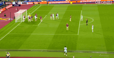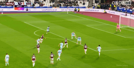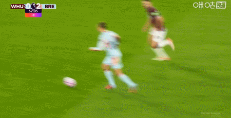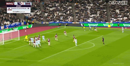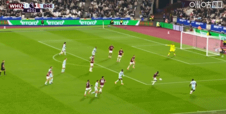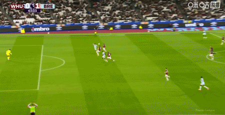 第43分鐘,沙德助攻,蒂亞戈射門得分,布倫特福德1-0西漢姆聯(lián)