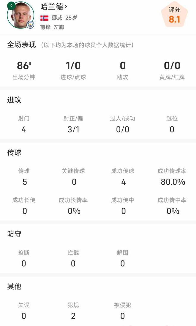 統(tǒng)計顯示,哈蘭德本場比賽出場86分鐘,4次射門3次射正,打入1球。