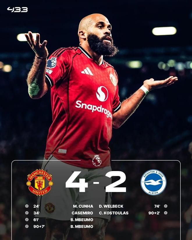 北京時(shí)間10月26日,英超第9輪比賽,曼聯(lián)主場(chǎng)4-2擊敗布萊頓,豪取三連勝,暫居英超第4位??紤]到布萊頓在客場(chǎng)已經(jīng)連贏3次曼聯(lián),這場(chǎng)比賽一開始雙方就展開了激烈的控球爭(zhēng)奪,布萊頓試圖誘使曼聯(lián)壓上,而阿莫林的球隊(duì)則堅(jiān)持長(zhǎng)傳戰(zhàn)術(shù)。20分鐘后,庫尼亞為紅魔首開紀(jì)錄,打入曼聯(lián)生涯首球。大約15分鐘后,卡塞米羅通過一記遠(yuǎn)射折射破門,將比分?jǐn)U大為2-0。